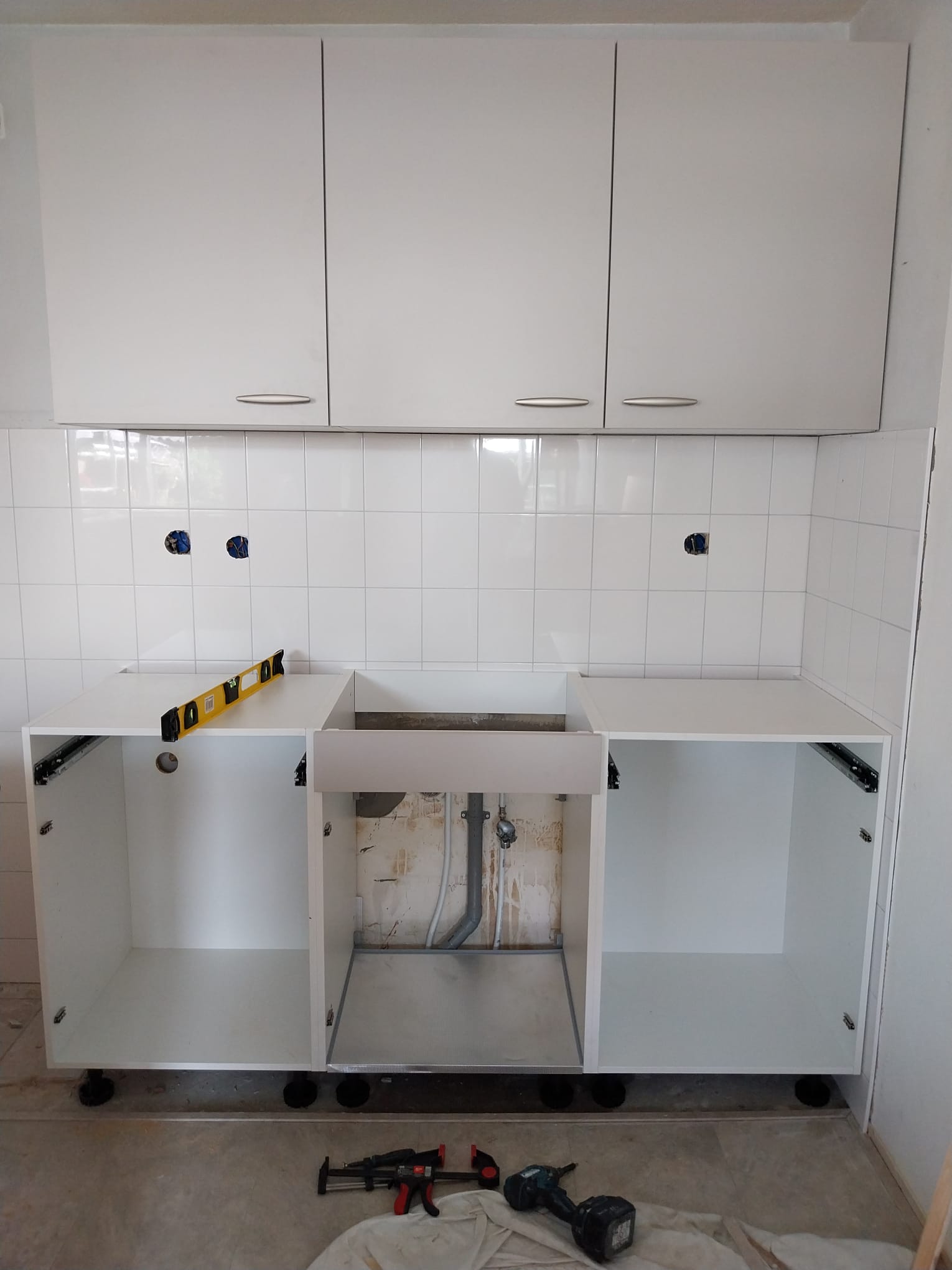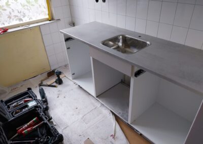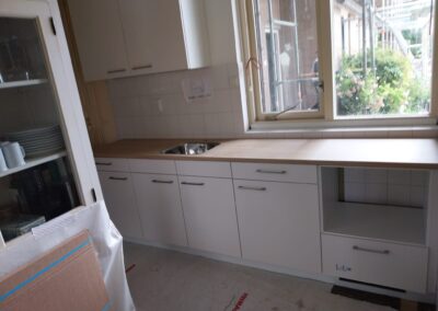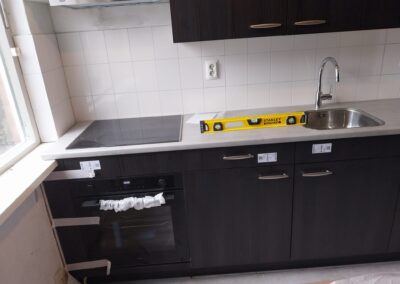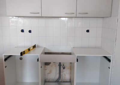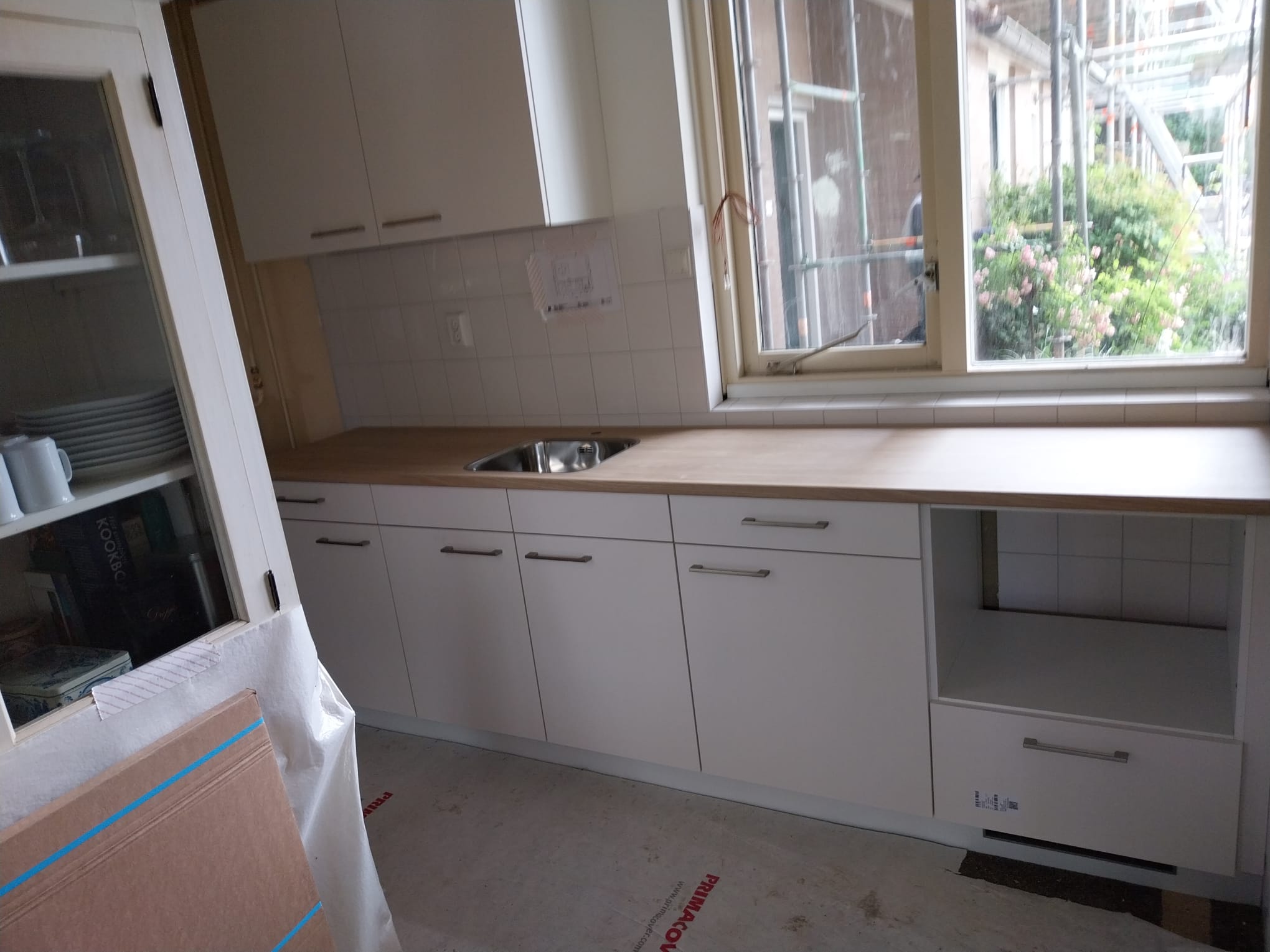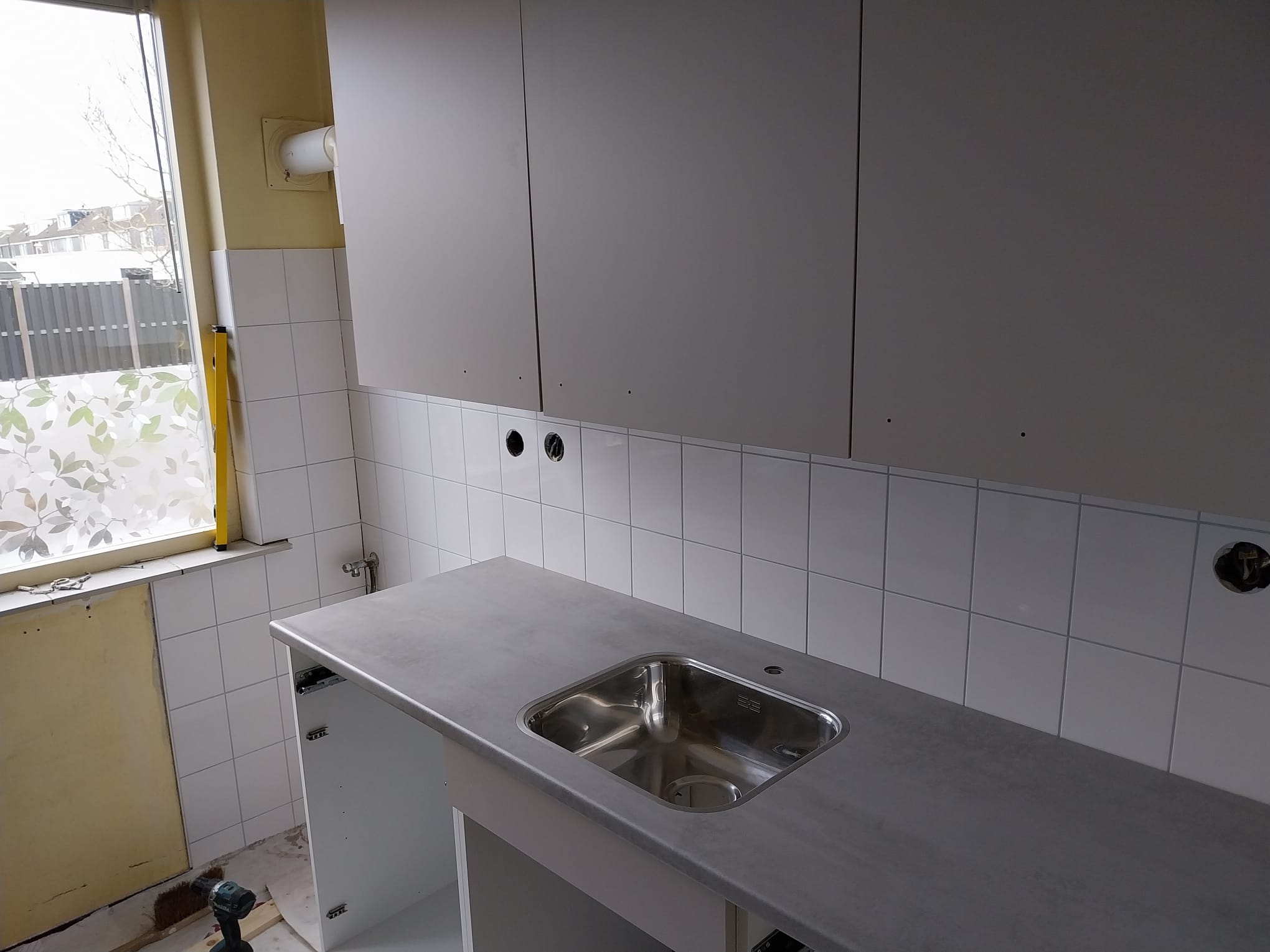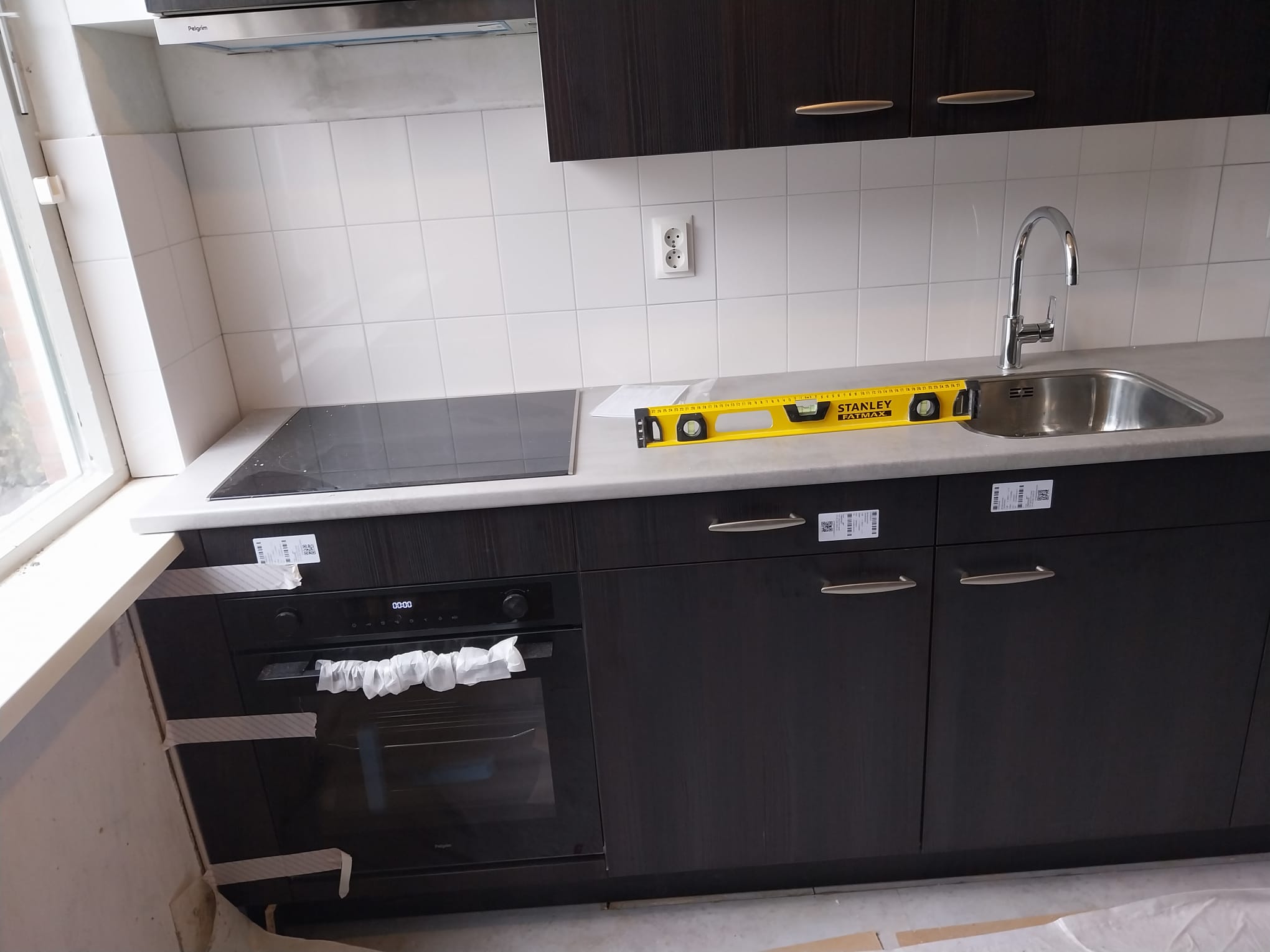 Uitgebreide keukenmontage en -installatie, inclusief montage van apparatuur en afwerkingsdetails.